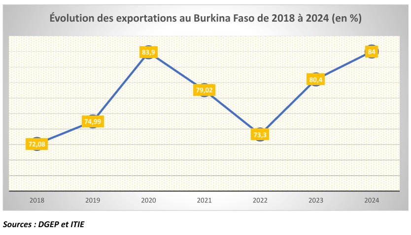 La prédominance des produits miniers, constitués essentiellement de l’or, dans la structure des exportations du Burkina Faso se poursuit depuis 2009 où l’or a détrôné le coton comme premier produit d’exportation. En 2024, les produits miniers ont représenté 84% de la valeur totale des exportations. On note une hausse de 3,6 % par rapport à 2023 où les produits miniers ont représenté 80,4% des exportations, selon la DGEP.