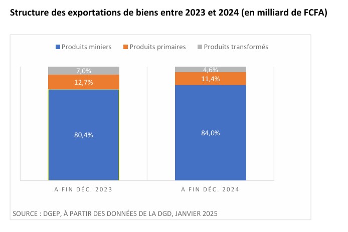 A côté des produits miniers, les produits transformés ne représentent que 4,6% des exportations en 2024 contre 11,4% pour les produits primaires. L’écart entre les produits miniers et les autres produits exportés est très grand. Quelles sont les implications de la prédominance des produits miniers dans les exportations ?