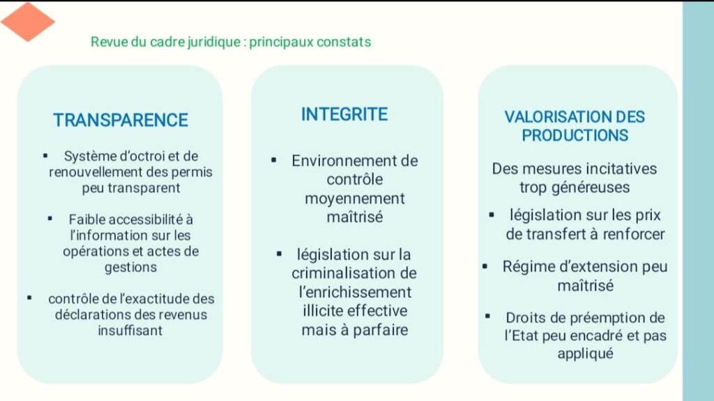 Ainsi, donc, l’audit a relevé le manque de transparence dans le système d’octroi et de renouvellement des permis. À travers l’audit, la Cour des comptes a souligné la faible accessibilité à l’information sur les opérations et actes de gestion et l’insuffisance de contrôle de l’exactitude des déclarations des revenus. L’institution de contrôle a aussi épinglé l’environnement de contrôle moyennement maîtrisé et la gestion de la législation sur la criminalisation de l’enrichissement illicite effective. Du point de vue, de la valorisation des productions, la Cour des comptes a reproché des mesures incitatives, trop généreuses et le régime d’extension peu maîtrisé. Latin Poda et ses collaborateurs ont aussi regretté les Droits de préemption de l’Etat peu encadrés et pas appliqués. Et enfin, la législation sur les prix de transfert à renforcer.