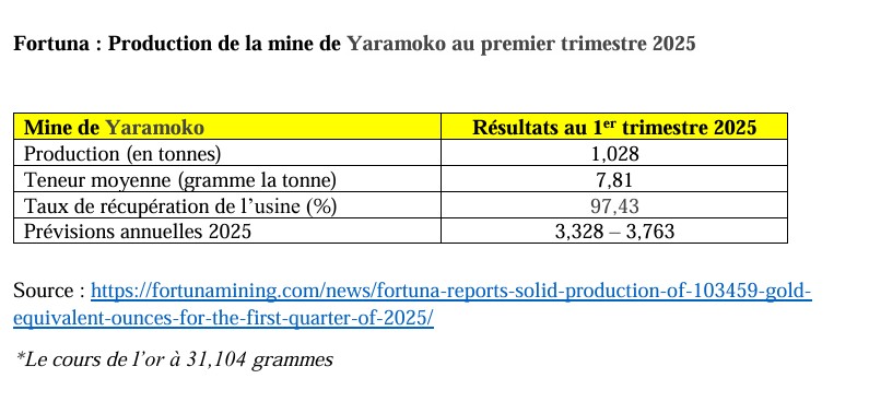 Fortuna Mining a annoncé ce 10 avril 2025, une solide production de 103 459 onces*, équivalant à 3,217 tonnes d’or au premier trimestre 2025. Fortuna Mining exploite 5 mines dont 02 mines en Afrique de l’Ouest et 3 en Amérique latine. Les 02 mines en Afrique de l’Ouest sont Séguéla, en Côte d’Ivoire et Yaramoko, au Burkina Faso.