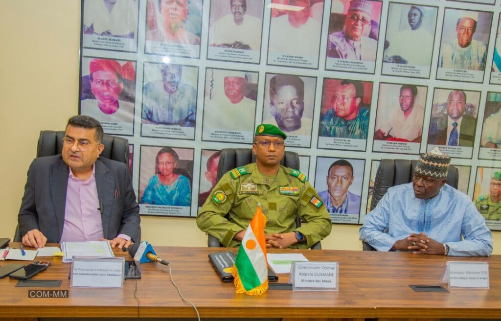 Le gouvernement a signé le 23 avril 2025 un accord de joint-venture avec la société Suvarna Royal Gold Trading LLC pour la mise en place d’une raffinerie d’or. Nommée Royal Gold Niger SA, c’est le ministre des Mines du Niger, le Commissaire-Colonel Abarchi Ousmane et son homologue chargé du Budget, Mamane Sidi et le Président Directeur Général de la Société Survana Royal Gold Trading LLC, M. Pattni Kamlesh Mansukhal Damji qui ont signé l’accord.