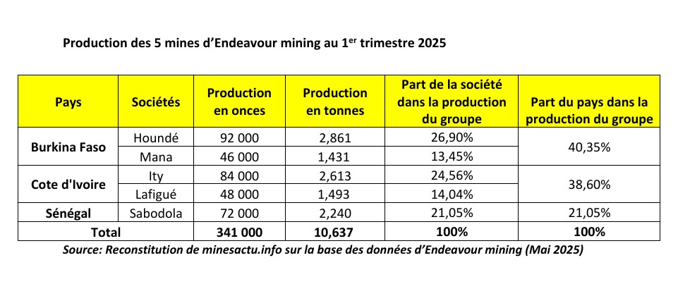Endeavour mining exploite 5 mines, toutes en Afrique de l’Ouest dont 2 au Burkina Faso (Houndé Gold et Mana), 2 en Côte d’Ivoire (Ity et Lafigué) et la mine de Sabodala-Massawa au Sénégal. Au premier trimestre 2025, la production cumulée des 5 mines est de 10,637 tonnes d’or.