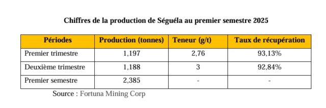 La production d’or de la mine de Séguéla est restée constante durant les deux trimestres de l’année 2025. En effet, elle a produit 38186 onces (1,188 tonnes) au 2eme trimestre contre 38500 onces (1,197 tonnes) au premier, soit une production totale de 2,385 tonnes (76686 onces) d’or au premier semestre 2025.