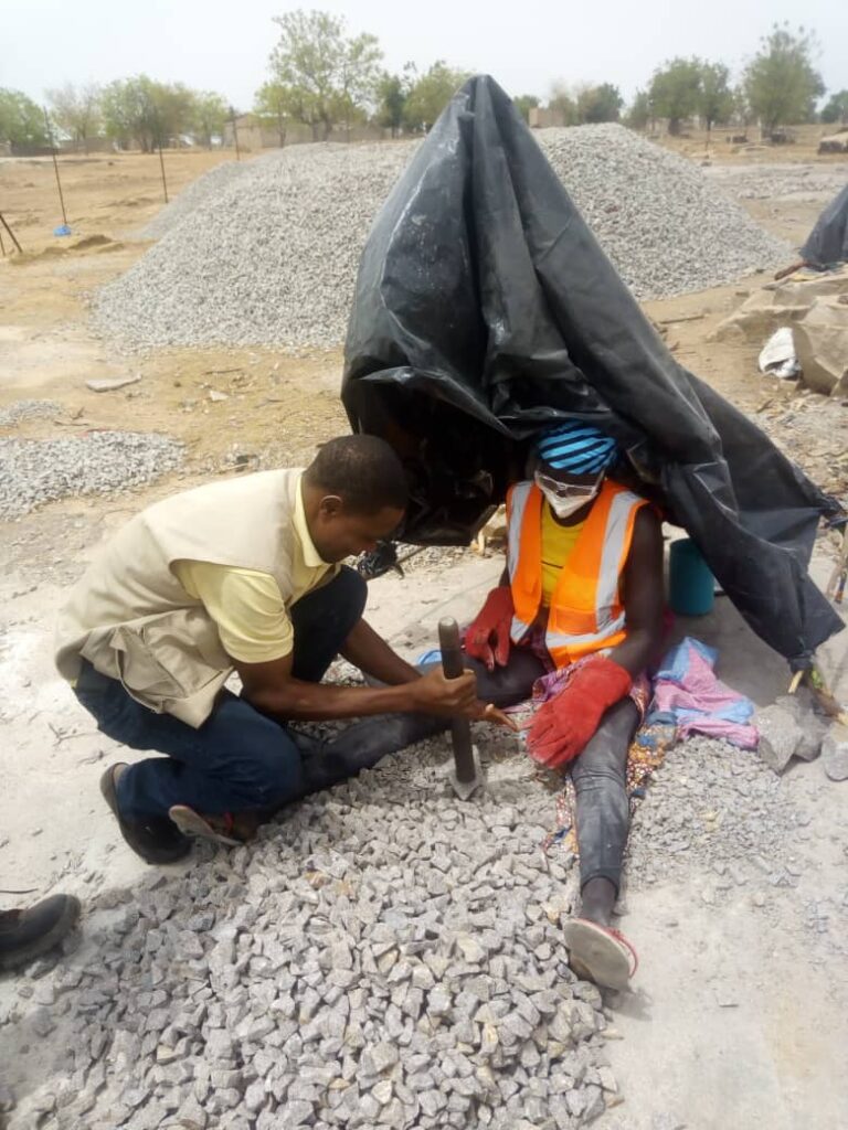 Après l’extraction du granite, nous passons au concassage. Tout se fait à la main parce que nous n’avons pas de machine. La carrière fonctionne de 8h à 12h, en fonction de la disponibilité des blocs à concasser. Nous avons présentement 24 femmes concasseuses et 2 hommes extracteurs sur le site. En saison pluvieuse, les femmes retournent à leurs travaux champêtres. Nous disposons d’une chef d’équipe qui coordonne et vérifie le port des équipements de protection industrielle et le déroulement des activités sur le chantier. Une responsable des femmes concasseuses et un chef de chantier coordonnent l’extraction. Nous produisons périodiquement, c’est-à dire chaque 10 jours. Nous concassons à la main entre 400 et 450 plats, soit environ 18 m3 en 10 jours. Le travail d’approvisionnement est manuel et n’est pas rapide. Pour la distribution, nous ne disposons pas de moyens de transport. Les clients viennent sur place avec leurs véhicules pour le chargement.