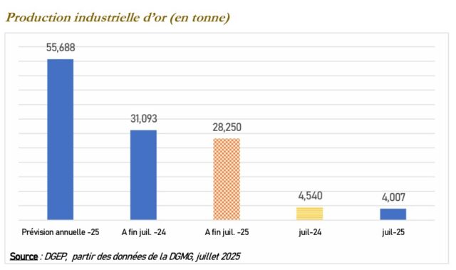 Pour le seul mois de juillet, la production est estimée à 4 tonnes et 007 Kg, en recul de 11,7% par rapport à juillet de l’année précédente, toujours selon la DGEP qui précise que : « Sur une prévision annuelle de 55 tonnes et 688 Kg pour 2025, le taux de réalisation à fin juillet s’établit à 50,7%, marquant un repli de 7,5% par rapport à l’année précédente à la même date ».