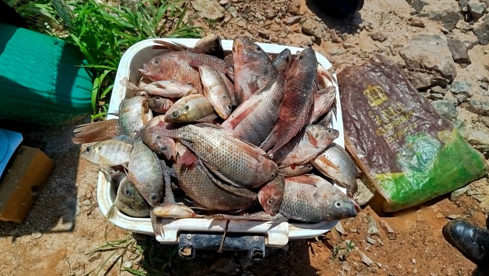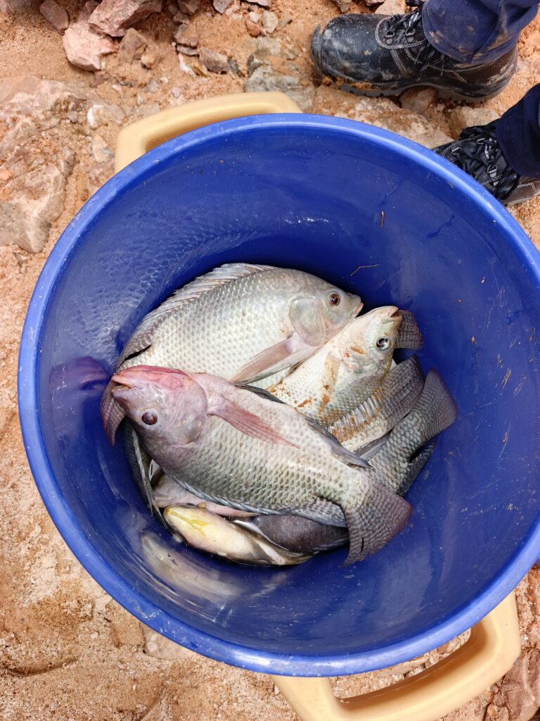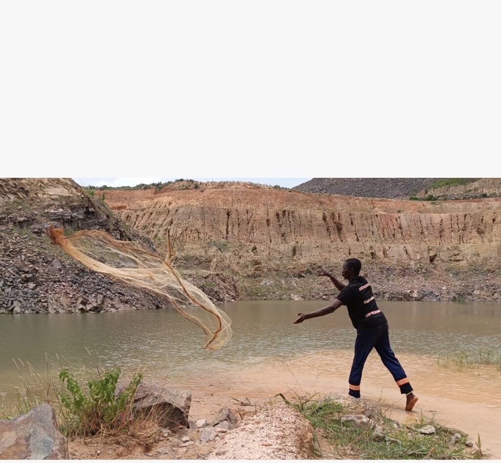 Consciente que refermer toutes les fosses minières est pratiquement impossible, WGO par son Directeur Général a réfléchi sur la possibilité de valoriser ses fosses autrement lorsque leurs caractéristiques le permettent. Ainsi, en 2024, les fosses NGBN 13.1 et NGBN 1.12 situées dans la zone minière de Nogbelé ont été identifiées pour un projet de pisciculture. D’un poids moyen de 18 g, mil (1000) alevins de tilapia ont été ensemencés dans ces fosses à la date du 11 mars 2024. Après cinq mois, ces poissons avaient plus de 750 g au mois. Cela a été possible grâce au suivi journalier assuré par le Coordonnateur Environnement M. Seydou TAMBOURA et son équipe à travers l’apport en aliments et d’autres soins. Selon M. TAMBOURA, la production annuelle attendue est d’environ cinq (5) tonnes de poissons.