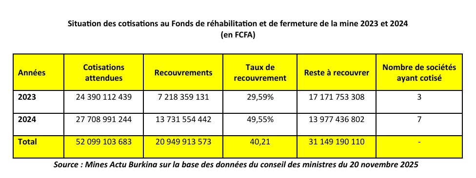 Sur un montant de 52,099 milliards FCFA attendus au titre du Fonds de réhabilitation et de fermeture de la mine en 2023 et 2024, c’est la somme de 20,949 milliards FCFA qui a été recouvrée, soit un taux de recouvrement de 40,21%. Il se dégage un reste à recouvrer de 31,149 milliards FCFA. L’information issue des rapports annuels conjoints, portant sur l’état et la gestion du Fonds de réhabilitation et de fermeture de la mine, au titre des exercices 2023 et 2024, a fait l’objet d’une communication orale au cours du conseil des ministre du jeudi 20 novembre 2025.