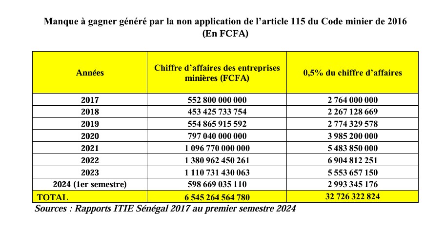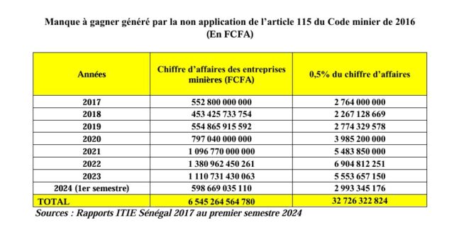 Sur la base d’une simulation qui exploite les données des rapports de l’Initiative pour la transparence dans les Industries extractives (ITIE) du Sénégal, le manque à gagner suite à cette non opérationnalisation est de 32,726 milliards FCFA entre la période 2017 et le premier semestre 2024. Mines Actu Burkina a obtenu ce chiffre sur la base des données ITIE. Le chiffre d’affaires a été obtenu à partir des recettes d’exportations des produits miniers. Entre 2017 et le premier semestre 2024, le chiffre d’affaires du secteur a été évalué à 6 545 264 564 780 FCFA.