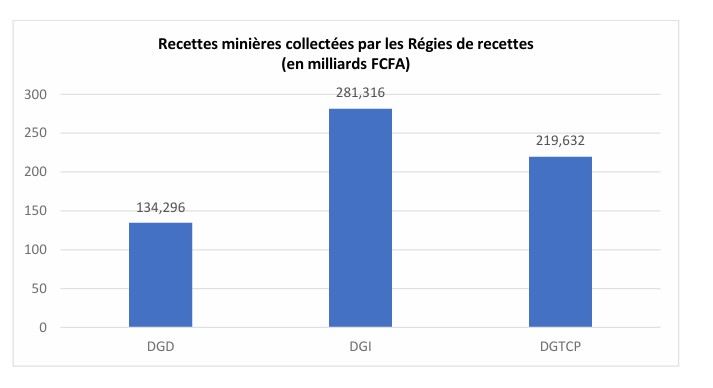 La Direction générale des Impôts (DGI) demeure le principal collecteur des recettes minières avec 259,316 milliards FCFA, représentant 45,95% des recettes collectées dans le secteur. Elle est suivie par la Direction générale du Trésor et de la Comptabilité publique (DGTCP) qui a collecté des recettes non fiscales à hauteur de 225,67 milliards FCFA, soit 37,8 % des recettes collectées. La contribution de la Direction générale des Douanes (DGD) s’élève à 134,30 milliards FCFA (21,94%).