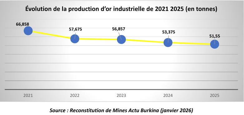 La production 2025 est en baisse par rapport à 2024 où on a enregistré 53,375 tonnes d’or.