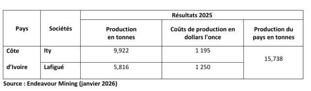 Le groupe Endeavour Mining exploite les mines d’Ity et de Lafigué en Cote d’Ivoire. Selon les résultats financiers et opérationnels provisoires de l’année 2025 publiés par le groupe le 29 janvier 2026, les 2 mines ont produit 15,738 tonnes d’or en 2025.