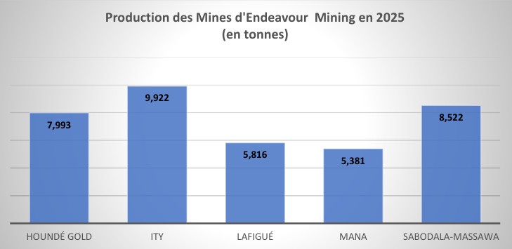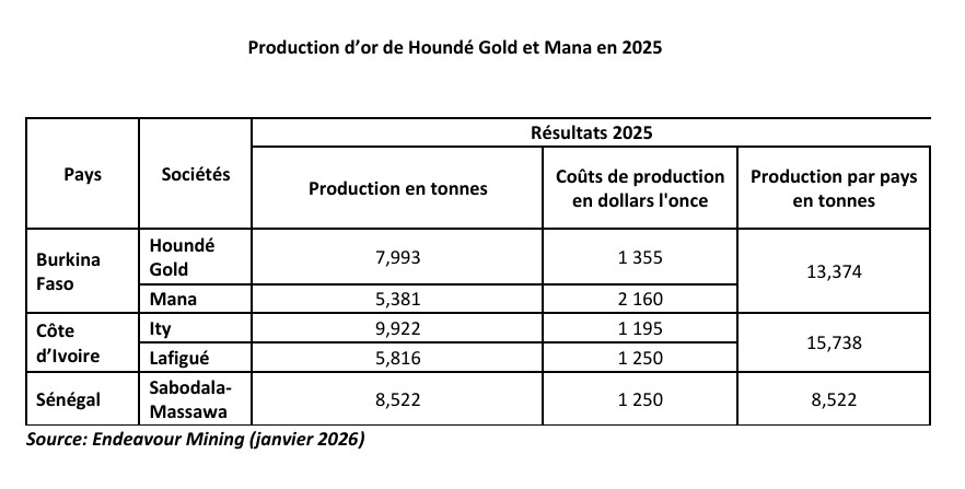 Le groupe Endeavour Mining exploite les mines de Houndé Gold et de Mana au Burkina Faso. Selon les résultats financiers et opérationnels provisoires de l’année 2025 publiés par le groupe le 29 janvier 2026, les 2 mines ont produit 13,374 tonnes d’or en 2025.