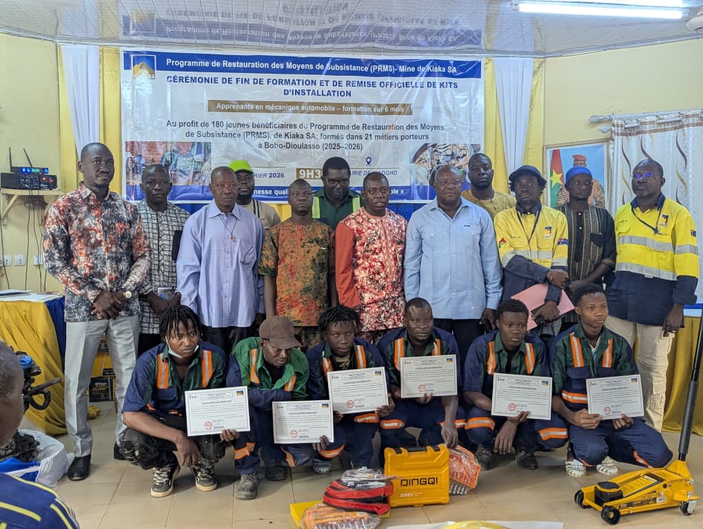 Dans le cadre de son Programme de restauration des moyens de subsistance (PRMS), la mine de Kiaka SA a formé 180 jeunes issus des communautés impactées par son projet minier en 21 métiers de leur choix. Les apprenants ont bénéficié de 3 à 6 mois de formation au cabinet Digital Indicator-TPJ de Bobo-Dioulasso en fonction de la filière. A la fin de formation, des attestations et des kits d’installation ont été remis aux apprenants. Cette cohorte de 180 jeunes est une première en attendant d’autres promotions.