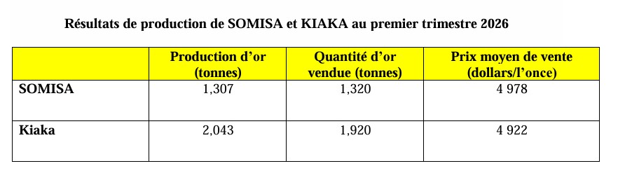 Il ressort de cette publication que les 2 mines ont produit 3,351 tonnes d’or durant le premier trimestre de cette année dont 1,307 tonnes produites par SOMISA et 2,043 tonnes par Kiaka.