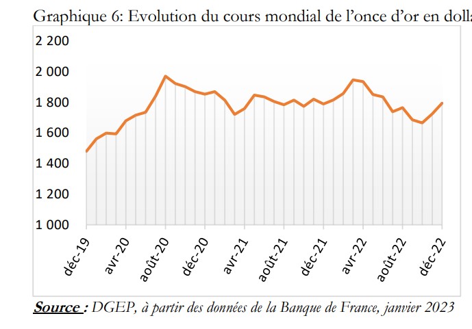 This fall in production is compensated by the good performance of the gold price. In December 2022, the price of an ounce of gold rose by 4.0% compared to November 2022, reaching 1,794.2 US dollars. On a year-on-year basis, the price of an ounce of gold is down by 0.3%. The ounce of gold recorded an average price of 1,728.4 US dollars in the fourth quarter of 2022, down by 0.1% compared to the previous quarter. The level of the gold price remains high in line with the uncertainties in the global economy.