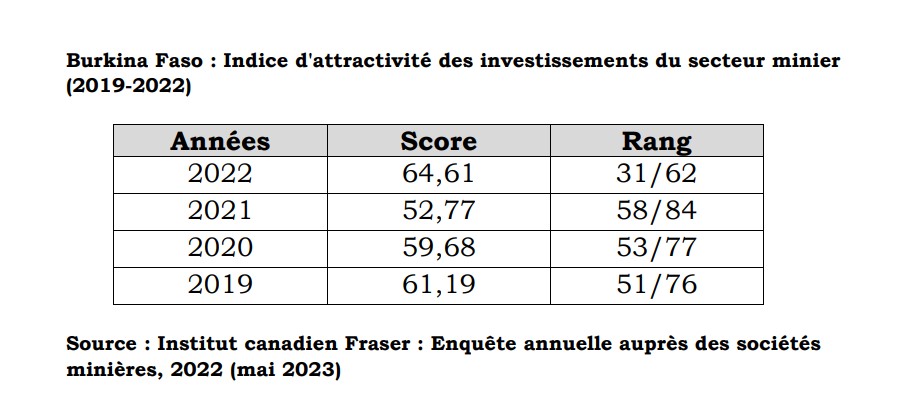 Burkina Faso’s attractiveness in terms of investment in the mining sector is not brilliant. According to the annual survey of mining companies, 2022 published on 3 May 2023 by the Canadian Fraser Institute, Burkina Faso ranked 31st in 2022 out of 62 countries, with a score of 64.61 out of 100. In 2022, Burkina Faso’s score improved compared to 2021, 2020 and 2019, when it ranked 58th out of 84 countries, 53rd out of 77 countries and 51st out of 76 countries respectively.