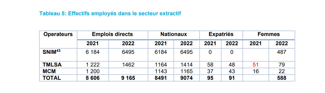 “The mining sector directly employs 9,165 people, 93.58% of whom are men (8,576) and 6.42% women (589), with 1% expatriates,” according to Mauritania’s EITI 2022 report. The 9,165 direct jobs represent 0.98% of the working population.